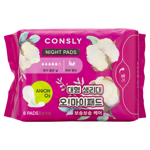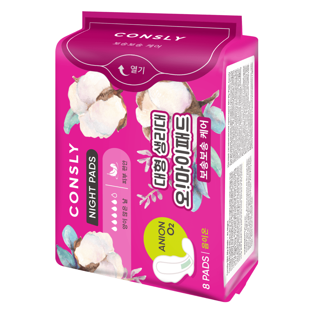Ультратонкие ночные прокладки с крылышками Consly Oh! My Pads обеспечивают надежную защиту и комфорт во время менструации. Их уникальный дизайн делает их незаметными, сохраняя уверенность и безопасность. Благодаря высокой впитываемости и дышащему материалу, прокладки оставляют кожу сухой на протяжении всей ночи, предотвращая неприятные ощущения. Они эффективно защищают от протеканий и благодаря анионовому чипу поддерживают чистоту и гигиеничность. Применение: удалите защитную бумагу с клеевой полосы и закрепите прокладку на внутренней поверхности белья. Для поддержания гигиены рекомендуется менять прокладку каждые 4-6 часов. Утилизируйте прокладки, заворачивая их в специальные гигиенические пакеты и выбрасывая в мусорный контейнер. Меры предосторожности: в случае раздражения, прекратите использование и проконсультируйтесь с врачом. INGREDIENTS/Состав: Airlaid Paper, SAP Paper, Perforated Hot Air Through Nonwoven, Hot Air Through Waterproof Nonwoven, Anion Chip, White Breathable PE Film, White Printed Packing PE Film, Back Release Paper, Wing Release Paper, Fast Easy Open Tape, Back Glue, Position Glue. Изготовитель: «Jinjiang Rongxin Maternal and Child Supplies Co.,Ltd», No.3, Xinya Road, Economic Development Zone (Wuli) Jinjiang, Fujian, Китай.