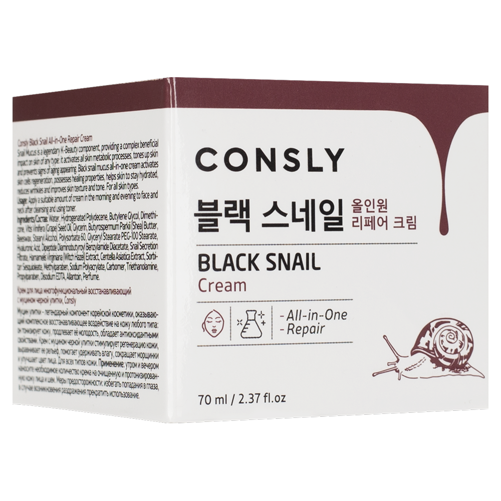 Муцин улитки – легендарный компонент корейской косметики, оказывающий комплексное восстанавливающее воздействие на кожу любого типа: он тонизирует кожу, продлевает её молодость, обладает антиоксидантными свойствами. Крем с муцином черной улитки стимулирует регенерацию кожи, выравнивает ее рельеф, помогает удерживать влагу, сокращает морщинки и улучшает цвет лица. Для всех типов кожи. Применение: утром и вечером наносите необходимое количество крема на очищенную и протонизированную кожу лица и шеи. Меры предосторожности: избегать попадания в глаза, в случае возникновения раздражения прекратить использование. Ingredients/Состав: Water, Cetyl Ethylhexanoate, Glycerin, Butylene Glycol, Cetearyl Alcohol, Glyceryl Stearate, Beeswax, PEG-100 Stearate, Dimethicone, Sorbitan Sesquioleate, PEG-90M, Phenoxyethanol, Acrylates/C10-30 Alkyl Acrylate Crosspolymer, Triethanolamine, Fragrance, Betaine, Tocopheryl Acetate, Ethylhexylglycerin, Disodium EDTA, Allantoin, Benzyl Salicylate, Hexyl Cinnamal, Linalool, Vitis Vinifera (Grape) Seed Oil, Aloe Barbadensis Leaf Extract, Centella Asiatica Extract, Snail Secretion Filtrate, Propanediol, 1,2-Hexanediol, Sodium Hyaluronate Crosspolymer, Hydrolyzed Glycosaminoglycans, Sodium Hyaluronate, Benzyl Glycol, Hydrolyzed Hyaluronic Acid, Hyaluronic Acid, Raspberry Ketone. Изготовитель: "SINDO P&G Co., Ltd", 28, Namdongseo-ro 270beon-gil, Namdong-gu, Incheon, Республика Корея.