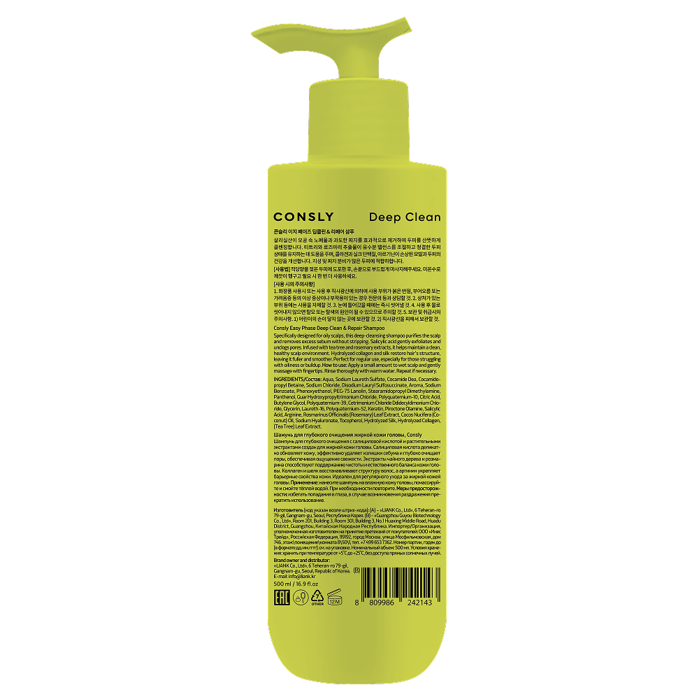 Шампунь для глубокого очищения с салициловой кислотой и растительными экстрактами создан для жирной кожи головы. Салициловая кислота деликатно обновляет кожу, эффективно удаляет излишки себума и глубоко очищает поры, обеспечивая ощущение свежести. Экстракты чайного дерева и розмарина способствуют поддержанию чистоты и естественного баланса кожи головы. Коллаген и шелк восстанавливают структуру волос, а аргинин укрепляет барьерные свойства кожи. Идеален для регулярного ухода за жирной кожей головы. Применение: нанесите шампунь на влажную кожу головы, помассируйте и смойте тёплой водой. При необходимости повторите. Меры предосторожности: избегать попадания в глаза, в случае возникновения раздражения прекратить использование. INGREDIENTS/Состав: Aqua, Sodium Laureth Sulfate, Cocamide Dea, Cocamidopropyl Betaine, Sodium Chloride, Disodium Lauryl Sulfosuccinate, Aroma, Sodium Benzoate, Phenoxyethanol, PEG-75 Lanolin, Stearamidopropyl Dimethylamine, Panthenol, Guar Hydroxypropyltrimonium Chloride, Polyquaternium-10, Citric Acid, Butylene Glycol, Polyquaternium-39, Cetrimonium Chloride Ddidecyldimonium Chloride, Glycerin, Laureth-16, Polyquaternium-52, Keratin, Piroctone Olamine, Salicylic Acid, Arginine, Rosmarinus Officinalis (Rosemary) Leaf Extract, Cocos Nucifera (Coconut) Oil, Sodium Hyaluronate, Tocopherol, Hydrolyzed Silk, Hydrolyzed Collagen, (Tea Tree) Leaf Extract. Изготовитель (код указан возле штрих-кода): (А) – «LIANK Co., Ltd», 6 Teheran-ro 79-gil, Gangnam-gu, Seoul, Республика Корея. (B) – «Guangzhou Guyou Biotechnology Co., Ltd», Room 201, Building 3, Room 301, Building 3, No.1 Huaxing Middle Road, Huadu District, Guangzhou, Китайская Народная Республика.