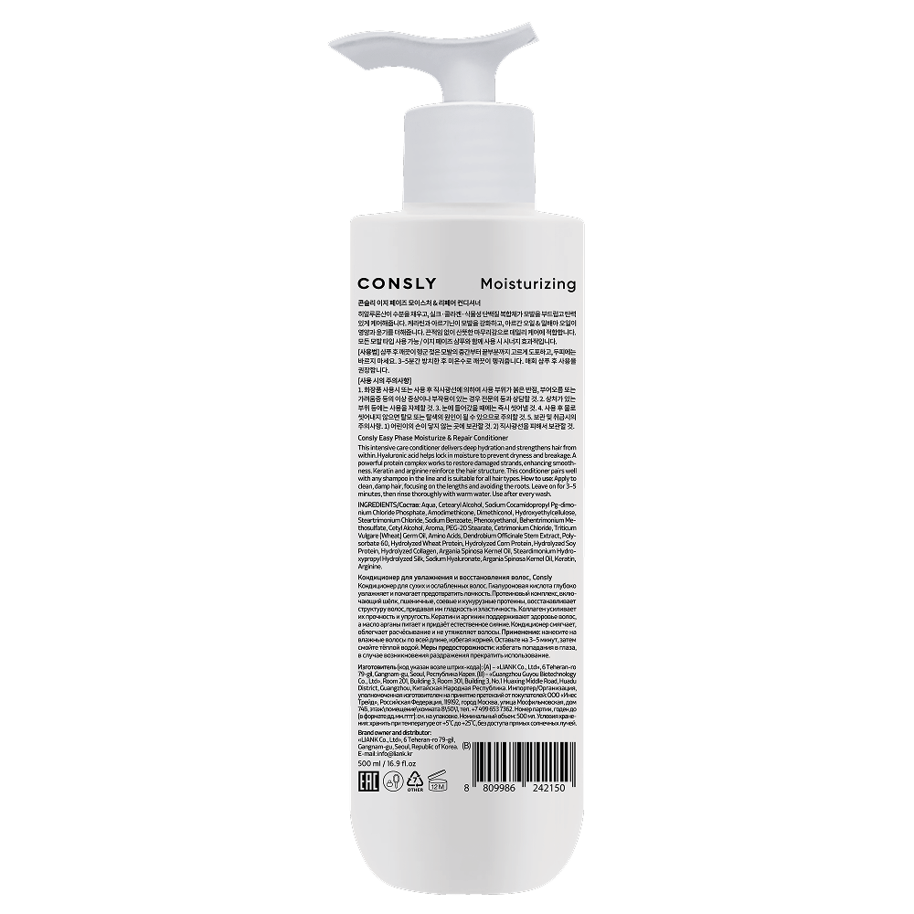 Кондиционер для сухих и ослабленных волос. Гиалуроновая кислота глубоко увлажняет и помогает предотвратить ломкость. Протеиновый комплекс, включающий шёлк, пшеничные, соевые и кукурузные протеины, восстанавливает структуру волос, придавая им гладкость и эластичность. Коллаген усиливает их прочность и упругость. Кератин и аргинин поддерживают здоровье волос, а масло арганы питает и придаёт естественное сияние. Кондиционер смягчает, облегчает расчёсывание и не утяжеляет волосы. Применение: нанесите на влажные волосы по всей длине, избегая корней. Оставьте на 3–5 минут, затем смойте тёплой водой. Меры предосторожности: избегать попадания в глаза, в случае возникновения раздражения прекратить использование. INGREDIENTS/Состав: Aqua, Cetearyl Alcohol, Sodium Cocamidopropyl Pg-dimonium Chloride Phosphate, Amodimethicone, Dimethiconol, Hydroxyethylcellulose, Steartrimonium Chloride, Sodium Benzoate, Phenoxyethanol, Behentrimonium Methosulfate, Cetyl Alcohol, Aroma, PEG-20 Stearate, Cetrimonium Chloride, Triticum Vulgare (Wheat) Germ Oil, Amino Acids, Dendrobium Officinale Stem Extract, Polysorbate 60, Hydrolyzed Wheat Protein, Hydrolyzed Corn Protein, Hydrolyzed Soy Protein, Hydrolyzed Collagen, Argania Spinosa Kernel Oil, Steardimonium Hydroxypropyl Hydrolyzed Silk, Sodium Hyaluronate, Argania Spinosa Kernel Oil, Keratin, Arginine. Изготовитель (код указан возле штрих-кода): (А) – «LIANK Co., Ltd», 6 Teheran-ro 79-gil, Gangnam-gu, Seoul, Республика Корея. (B) – «Guangzhou Guyou Biotechnology Co., Ltd», Room 201, Building 3, Room 301, Building 3, No.1 Huaxing Middle Road, Huadu District, Guangzhou, Китайская Народная Республика.