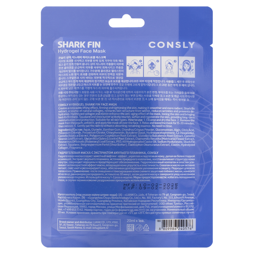 Гидрогелевая маска создает заметный лифтинг-эффект, укрепляя и подтягивая кожу, делая ее более гладкой и сияющей. Экстракт акульего плавника, источник природного коллагена, восстанавливает структуру кожи изнутри, сокращает морщины и предотвращает обезвоживание. Гидролизованный коллаген и эластин усиливают антивозрастной эффект маски, возвращая коже упругость и эластичность. Сквалан и масло ши активно питают, смягчают и регенерируют кожу, обеспечивая долгосрочное увлажнение и защиту. Подходит для всех типов кожи. Применение: после очищения и тонизирования кожи снимите защитные плёнки с маски, нанесите её на лицо, равномерно распределите, оставьте на 30 минут, затем удалите маску и завершите уход нанесением увлажняющего крема. Используйте маску 1–2 раза в неделю. Меры предосторожности: избегать попадания в глаза, в случае возникновения раздражения прекратить использование. Ingredients/Состав: Aqua, Glycerin, Xanthan Gum, Chondrus Crispus Powder, Glucomannan, Algin, Citric Acid, Potassium Chloride, Potassium Citrate, Chlorphenesin, Butylene Glycol, Hydroxyacetophenone, 1,2-Hexanediol, Centella Asiatica Extract, Polygonum Cuspidatum Root Extract, Scutellaria Baicalensis Root Extract, Camellia Sinensis Leaf Extract, Glycyrrhiza Glabra (Licorice) Root Extract, Chamomilla Recutita (Matricaria) Flower Extract, Rosmarinus Officinalis (Rosemary) Leaf Extract, PEG-40 Hydrogenated Castor Oil, Sodium Hyaluronate, Shark Fin Extract, Squalane, Butyrospermum Parkii (Shea Butter), Cladosiphon Okamuranus Extract, Elastin, Hydrolyzed Collagen, Fragrance. Изготовитель (код указан возле штрих-кода): (А) – «LIANK Co.,Ltd», 6 Teheran-ro 79-gil, Gangnam-gu, Seoul, Республика Корея. (B) – «Guangzhou Chuyu Biotechnology Со., Ltd.», No. 301, Factory 1, No. 333, Juhuashi Avenue, Huadu District, Guangzhou City, Guangdong Province, Китайская Народная Республика.