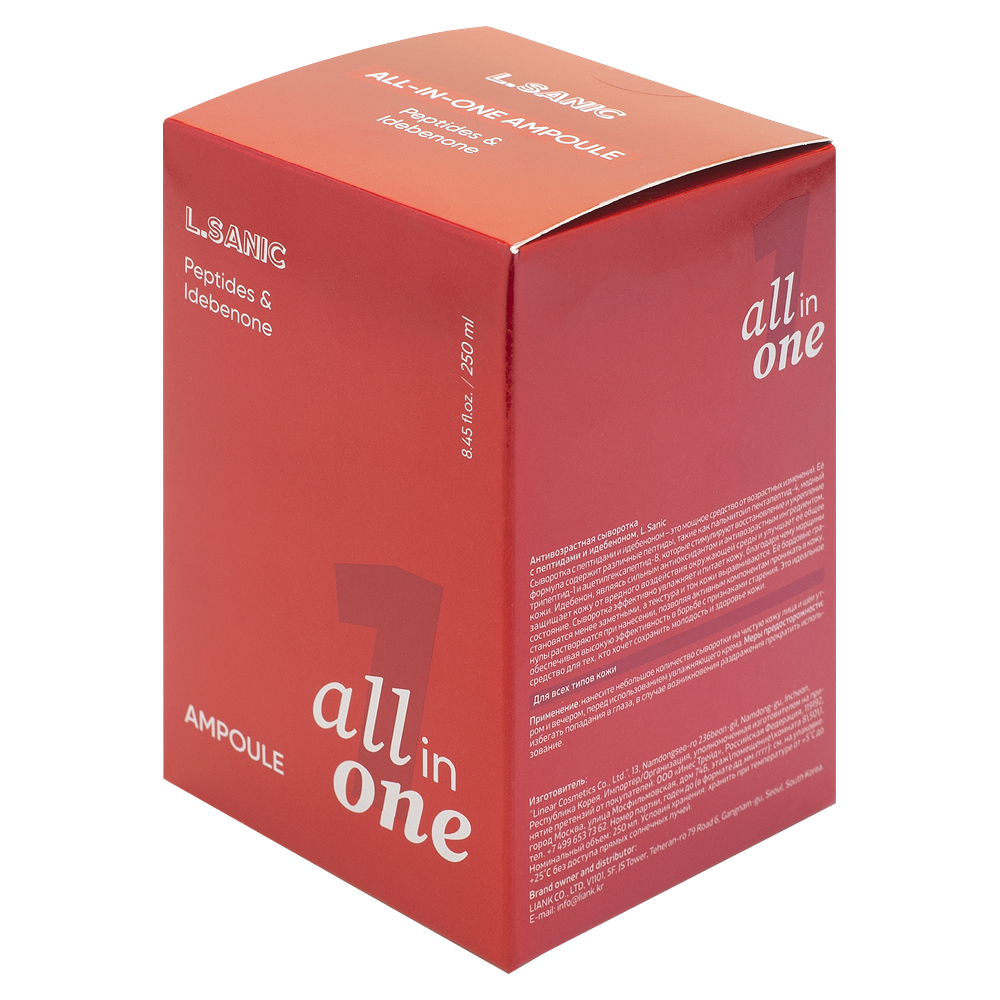 Сыворотка с пептидами и идебеноном — это мощное средство от возрастных изменений. Её формула содержит различные пептиды, такие как пальмитоил пентапептид-4, медный трипептид-1 и ацетилгексапептид-8, которые стимулируют восстановление и укрепление кожи. Идебенон, являясь сильным антиоксидантом и антивозрастным ингредиентом, защищает кожу от вредного воздействия окружающей среды и улучшает её общее состояние. Сыворотка эффективно увлажняет и питает кожу, благодаря чему морщины становятся менее заметными, а текстура и тон кожи выравниваются. Её бордовые гранулы растворяются при нанесении, позволяя активным компонентам проникать в кожу, обеспечивая высокую эффективность в борьбе с признаками старения. Это идеальное средство для тех, кто хочет сохранить молодость и здоровье кожи. Для всех типов кожи. Применение: нанесите небольшое количество сыворотки на чистую кожу лица и шеи утром и вечером, перед использованием увлажняющего крема. Меры предосторожности: избегать попадания в глаза, в случае возникновения раздражения прекратить использование. INGREDIENTS/Состав: Water, Glycerin, Butylene Glycol, Hydroxyacetophenone, Carbomer, Triethanolamine, PEG-60 Hydrogenated Castor Oil, Mannitol, Allantoin, Betaine, Ethylhexylglycerin, Panthenol, Hydroxyethylcellulose, Fragrance, Microcrystalline Cellulose, Sucrose, Disodium EDTA, Sodium Polyacrylate, Zea Mays (Corn) Starch, Hydroxypropyl Methylcellulose, CI 77491, 1,2-Hexanediol, Disodium Phosphate, Polyglyceryl-10 Laurate, Sodium Phosphate, Caprylic/Capric Triglyceride, Polysorbate 60, Hydrogenated Lecithin, Hydroxydecyl Ubiquinone, Palmitoyl Pentapeptide-4, Copper Tripeptide-1, Carnosine, Acetyl Hexapeptide-8, Glycine Soja (Soybean) Sterols, Poloxamer 407, Pentaerythrityl Tetra-di-t-butyl Hydroxyhydrocinnamate, Acetyl Tetrapeptide-5, Glutathione, Palmitoyl Tripeptide-1, Acetyl Tetrapeptide-3, Palmitoyl Tripeptide-5, Palmitoyl Tetrapeptide-7. Изготовитель: "Linear Cosmetics Co., Ltd.", 13, Namdongseo-ro 236beon-gil, Namdong-gu, Incheon, Республика Корея.