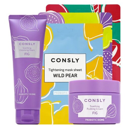 Набор Consly для сбалансированного ухода за сухой и чувствительной кожей Набор корейской косметики Consly создан для полноценного ухода за кожей и включает: — Успокаивающую очищающую пенку с экстрактом инжира, 120 мл — Успокаивающий крем с экстрактом инжира, 50 мл — Тканевую маску с экстрактом японской сливы, 25 мл — Тканевую маску с экстрактом инжира, 25 мл — Тканевую маску с экстрактом дикой груши, 25 мл Пенка с экстрактом инжира мягко очищает кожу, удаляя загрязнения и макияж, предотвращает ощущение сухости и стянутости. Подходит для нормальной, сухой и чувствительной кожи, дарит свежесть и комфорт. Крем с экстрактом инжира глубоко увлажняет и восстанавливает кожу, повышает её эластичность, возвращает мягкость и здоровый вид. Пробиотики укрепляют микробиом и защищают от агрессивного воздействия окружающей среды. Тканевая маска с экстрактом японской сливы оказывает омолаживающее действие: увлажняет, питает, улучшает эластичность и тонус кожи, возвращает сияние и помогает замедлить процессы старения. Тканевая маска с экстрактом инжира глубоко увлажняет и успокаивает кожу, дарит комфорт, повышает её эластичность и мягкость. Тканевая маска с экстрактом дикой груши подходит для комбинированной и жирной кожи: регулирует себум, уменьшает видимость пор, оказывает антиоксидантное и успокаивающее действие, сохраняя свежесть и ухоженный вид. Набор обеспечивает комплексный уход — от очищения и увлажнения до питания, восстановления и защиты. Он помогает поддерживать кожу здоровой, мягкой и сияющей. Способ применения пенки: нанесите небольшое количество средства на влажную кожу лица, мягко помассируйте, затем смойте тёплой водой. Способ применения крема: после очищения и тонизирования кожи нанесите крем на лицо, шею и декольте, равномерно распределите до полного впитывания. Способ применения тканевой маски: наложите маску на очищенную кожу лица, оставьте на 15–20 минут, затем снимите, а остатки эссенции мягко распределите по коже, не смывая.
